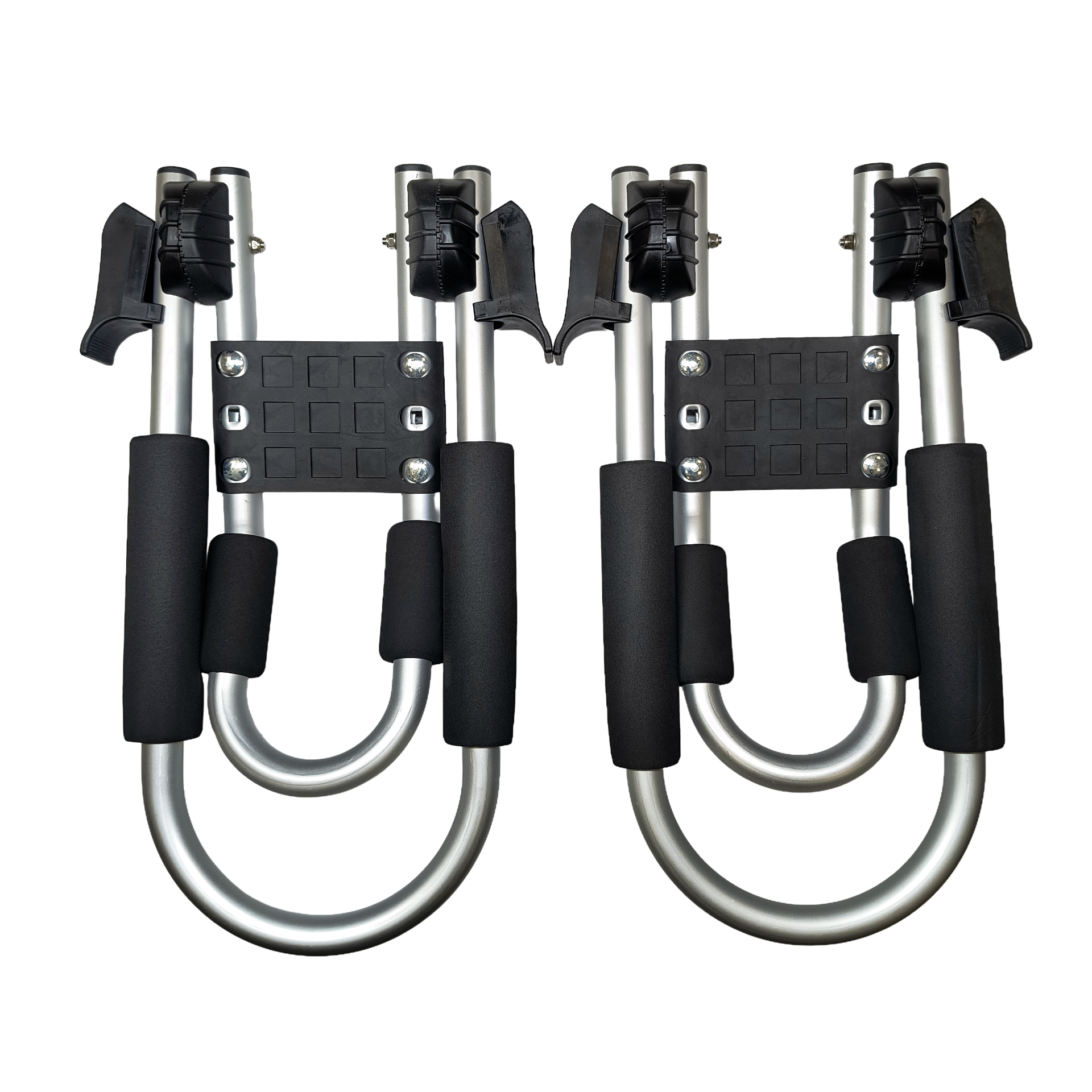 Összecsukható alumínium kajaktartó egy kajak biztonságos szállításához, tetőcsomagtartóra szerelve. Praktikus, helytakarékos megoldás, puha borítással és stabil rögzítéssel.